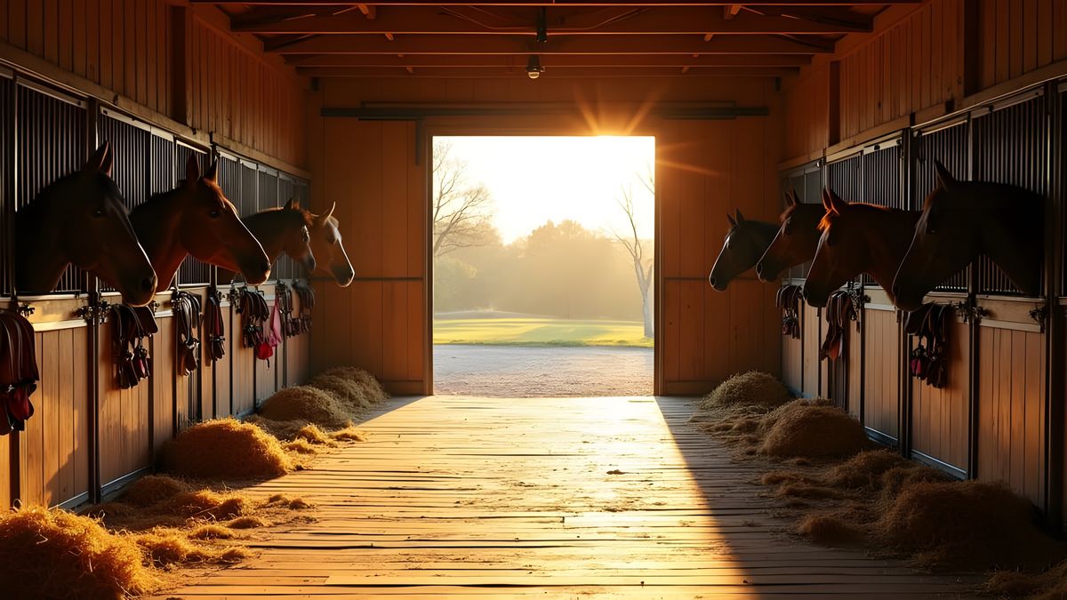 This image shows the interior of a horse barn at golden hour. Horses stand in stalls filled with hay and straw. Saddles and bridles hang on the wooden walls.