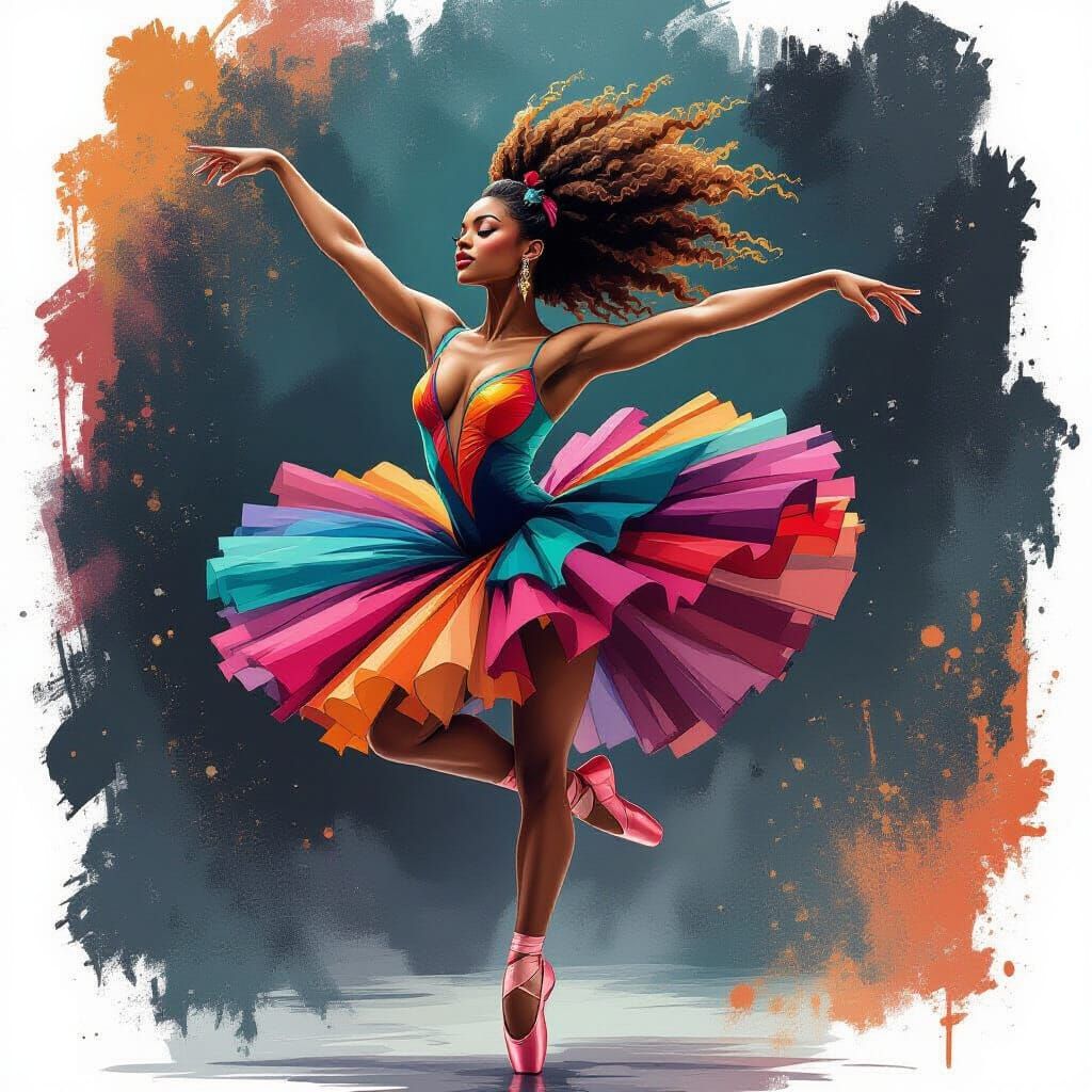 This image captures a powerful African American ballerina in a dramatic pointe pose, her natural hair and vibrant tutu flowing. Rendered with painterly realism and cinematic lighting.