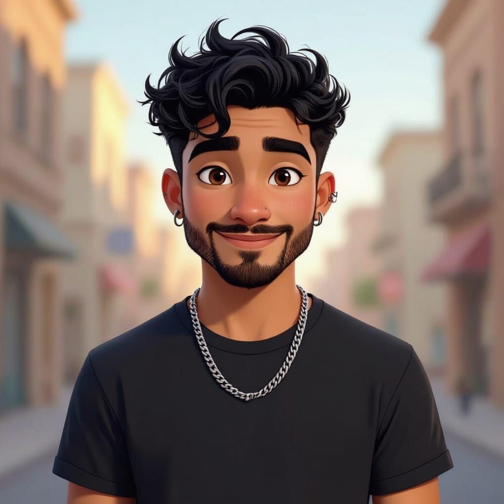 This image shows a young man with curly hair, a beard, and tattoos, rendered as a polished 3D character. The artwork features smooth textures, detailed facial features and soft, cinematic lighting.