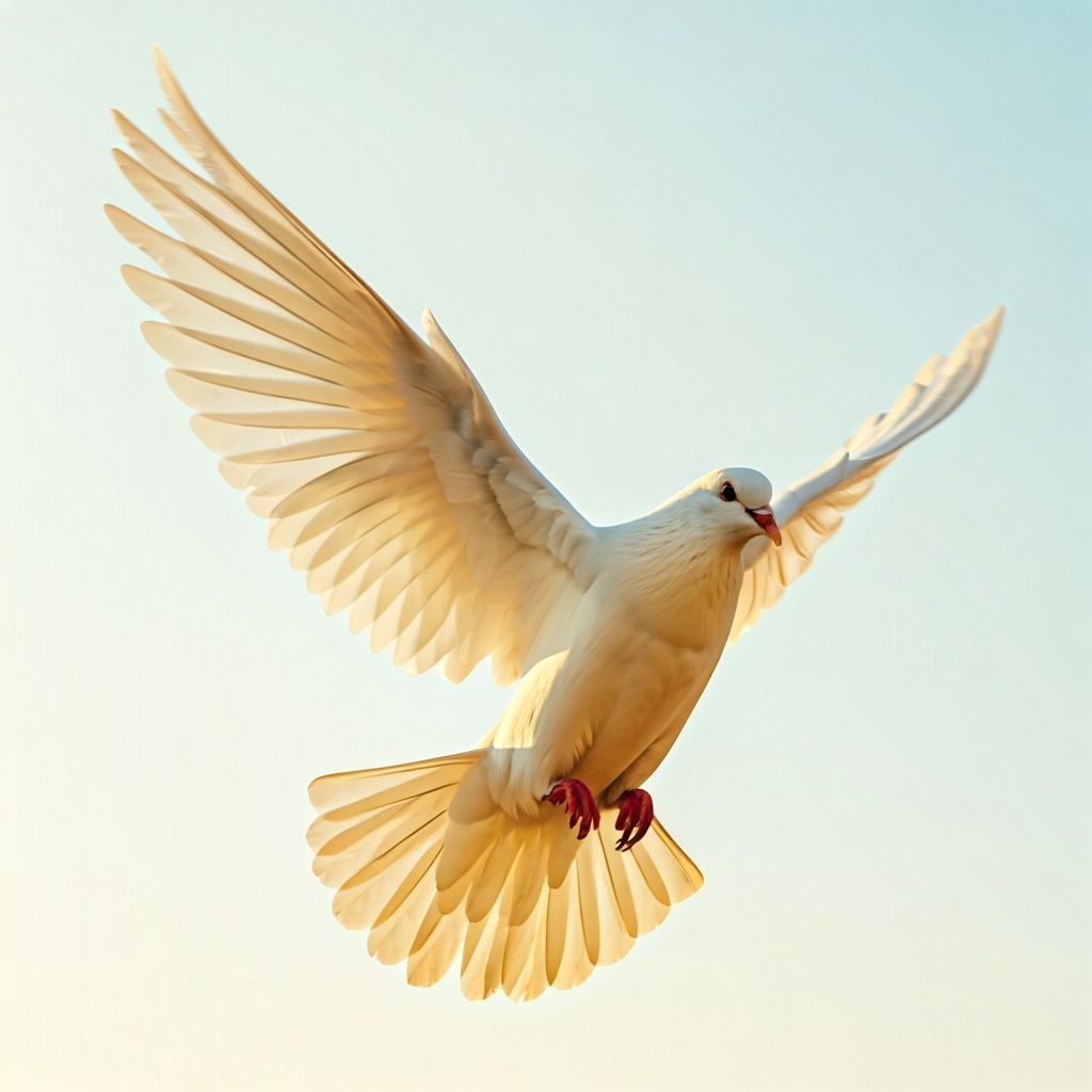 This image shows a white dove in flight, its wings spread wide against a backdrop of golden light and a clear sky. The scene evokes themes of peace and spirituality.