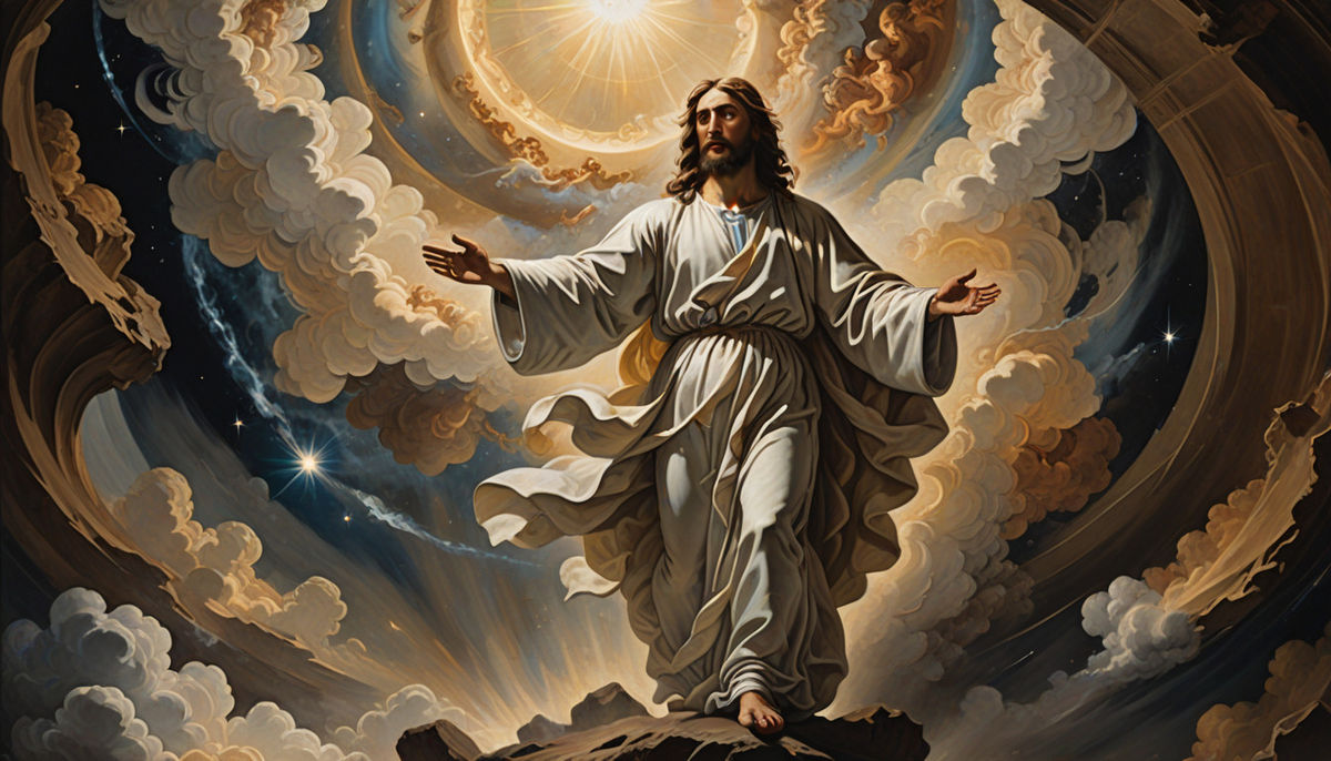 This striking Baroque fresco depicts Jesus stepping out of a swirling wormhole and into a desolate, rocky landscape, surrounded by cherubim and cosmic rays. Soft clouds and shimmering halos complement the dramatic, Caravaggio-inspired lighting.