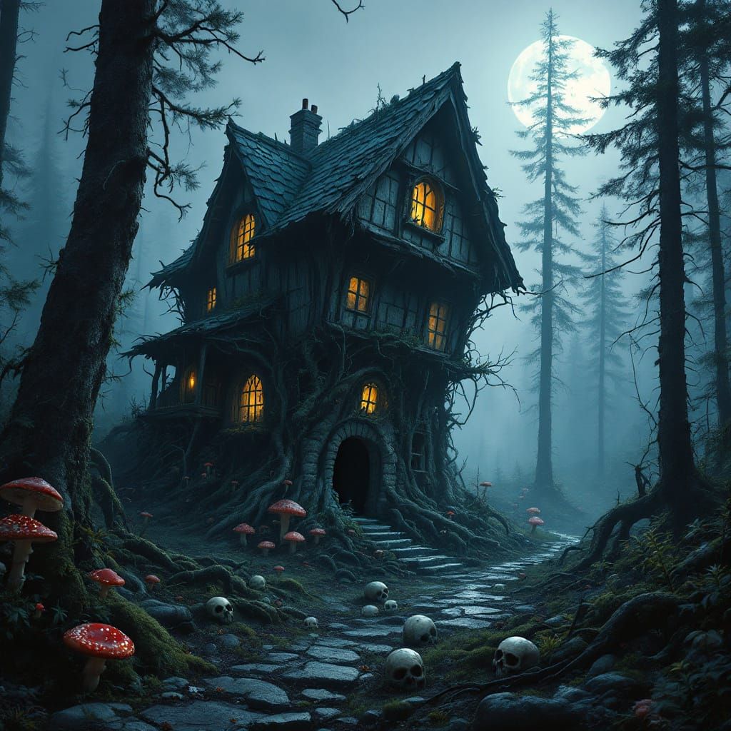 A hyper-detailed, gothic fantasy horror scene of a decaying witch's cottage in a foggy forest, with unsettling details and dramatic, dark lighting.