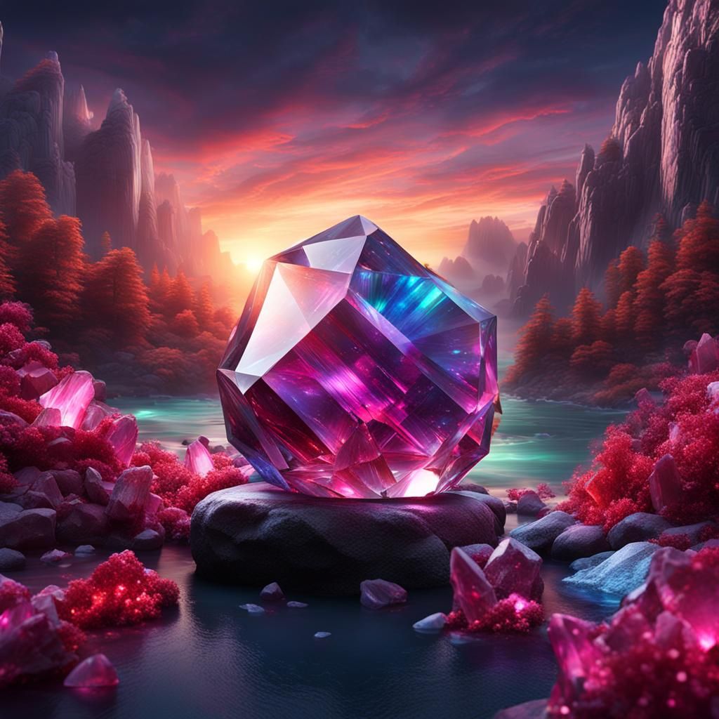 This image shows a Lumix GH5 camera made of crystal. The detailed digital painting features deep colors and intricate details, embodying a fantastical, high-resolution concept art style.