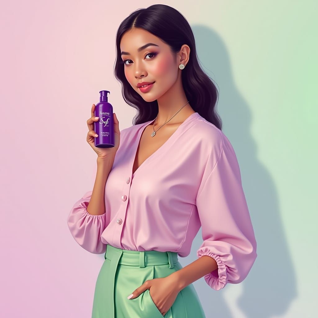 A photorealistic image features a woman in pastel pink and green attire holding a purple body spray bottle. The background blends light pink, green, and purple, creating a soft, elegant aesthetic.