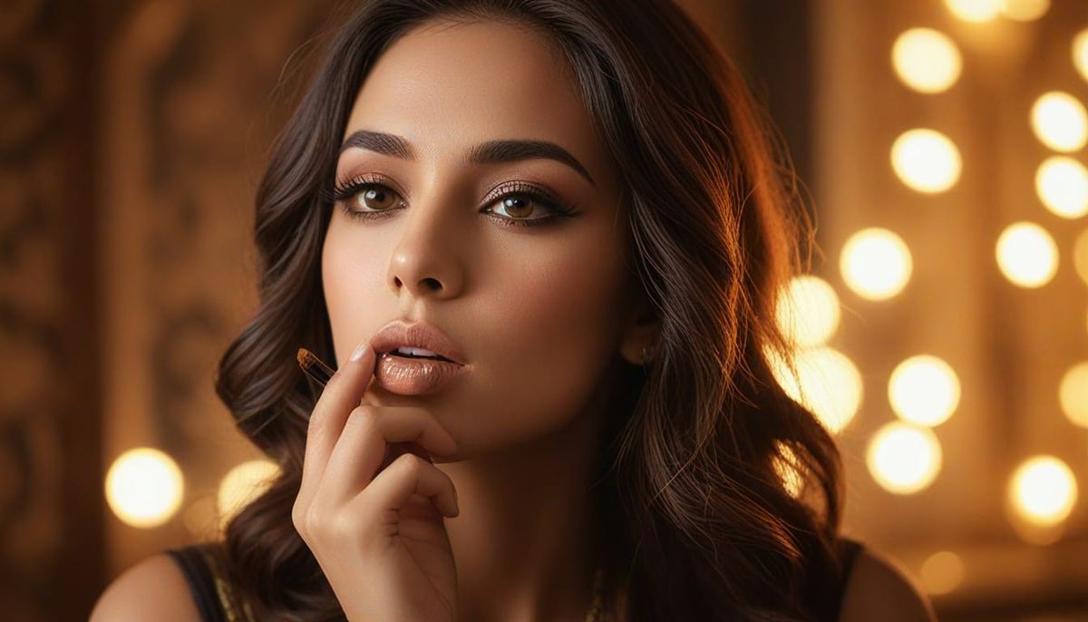 A young woman lost in thought as she applies makeup to her lips, set against a backdrop of intricate Arabic calligraphy and warm, pastel colors, bathed in softbox lighting with a gentle, golden glow.