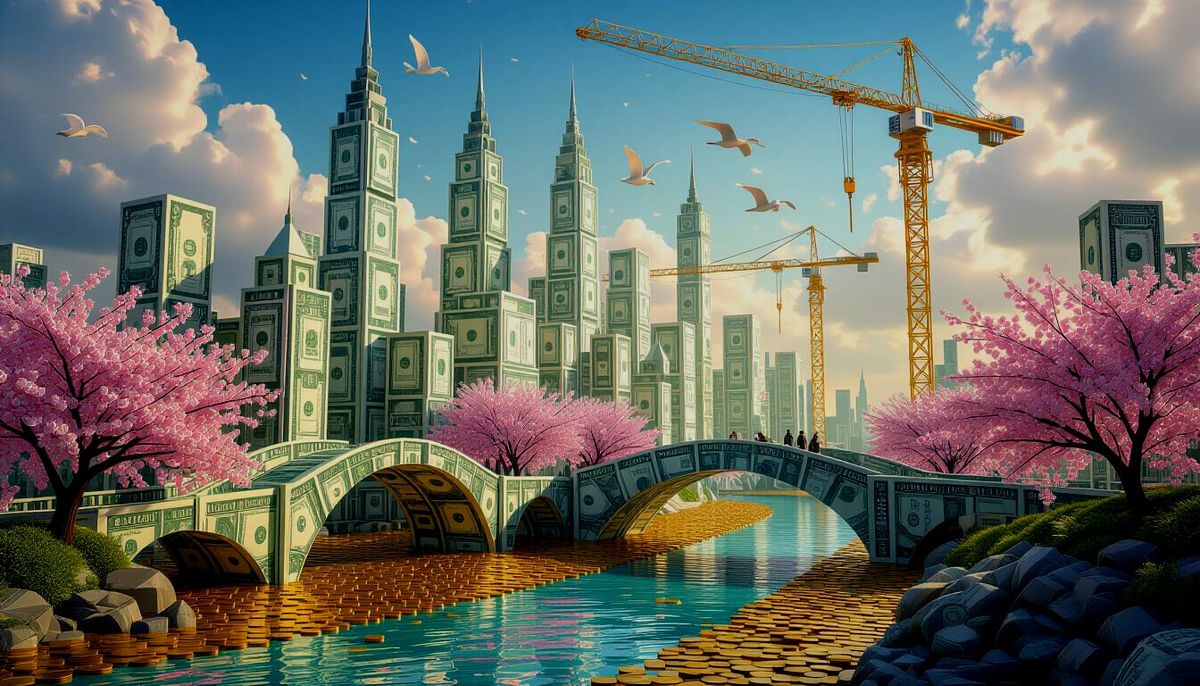 A dreamlike cityscape constructed from folded money, featuring origami skyscrapers, bridges, and trees. This hyper-detailed 3D render creates a whimsical yet majestic scene with glowing, surreal wonder.