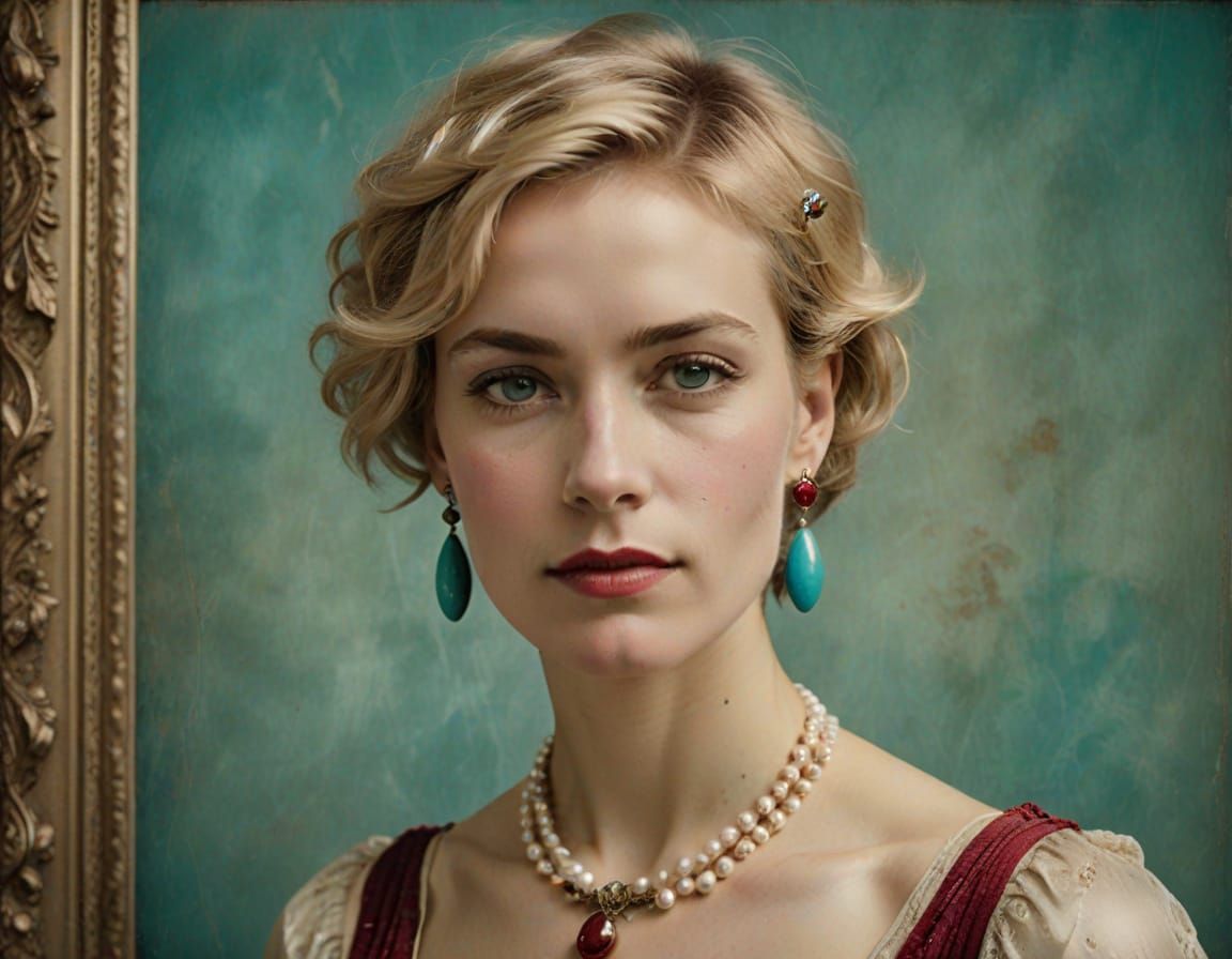 This image shows a portrait of a woman with short blond hair wearing a pearl necklace and turquoise earrings. The artwork has a vintage aesthetic with subtle film grain and muted sepia tones.