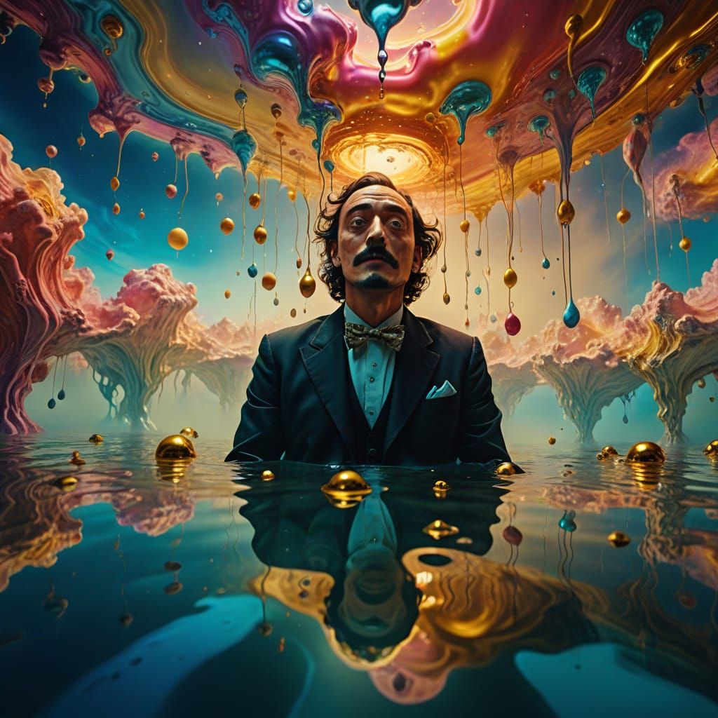 This image shows a person floating in a dreamlike state amidst a surreal, melting world. Macro photography captures vibrant, swirling colors under soft, golden lighting, creating an ethereal and fantastical scene.