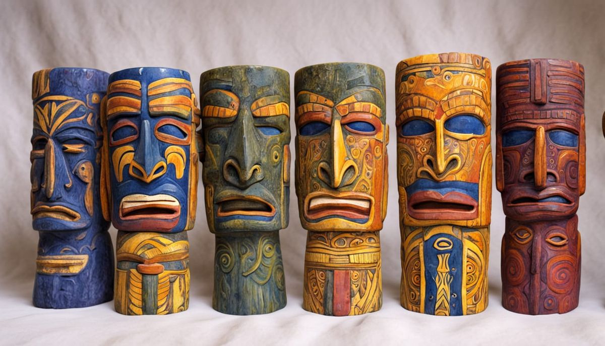 This image shows intricately carved, colorful tiki mugs with a retro, exotic style. The artwork evokes a blend of comic book aesthetics and classic illustration techniques.