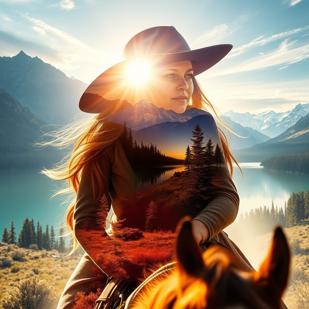 This image shows a woman explorer on horseback, her face rendered in a hyperrealistic double exposure. The overlay reveals a serene landscape of mountains, trees, and lakes at sunset, bathed in a magical glow.
