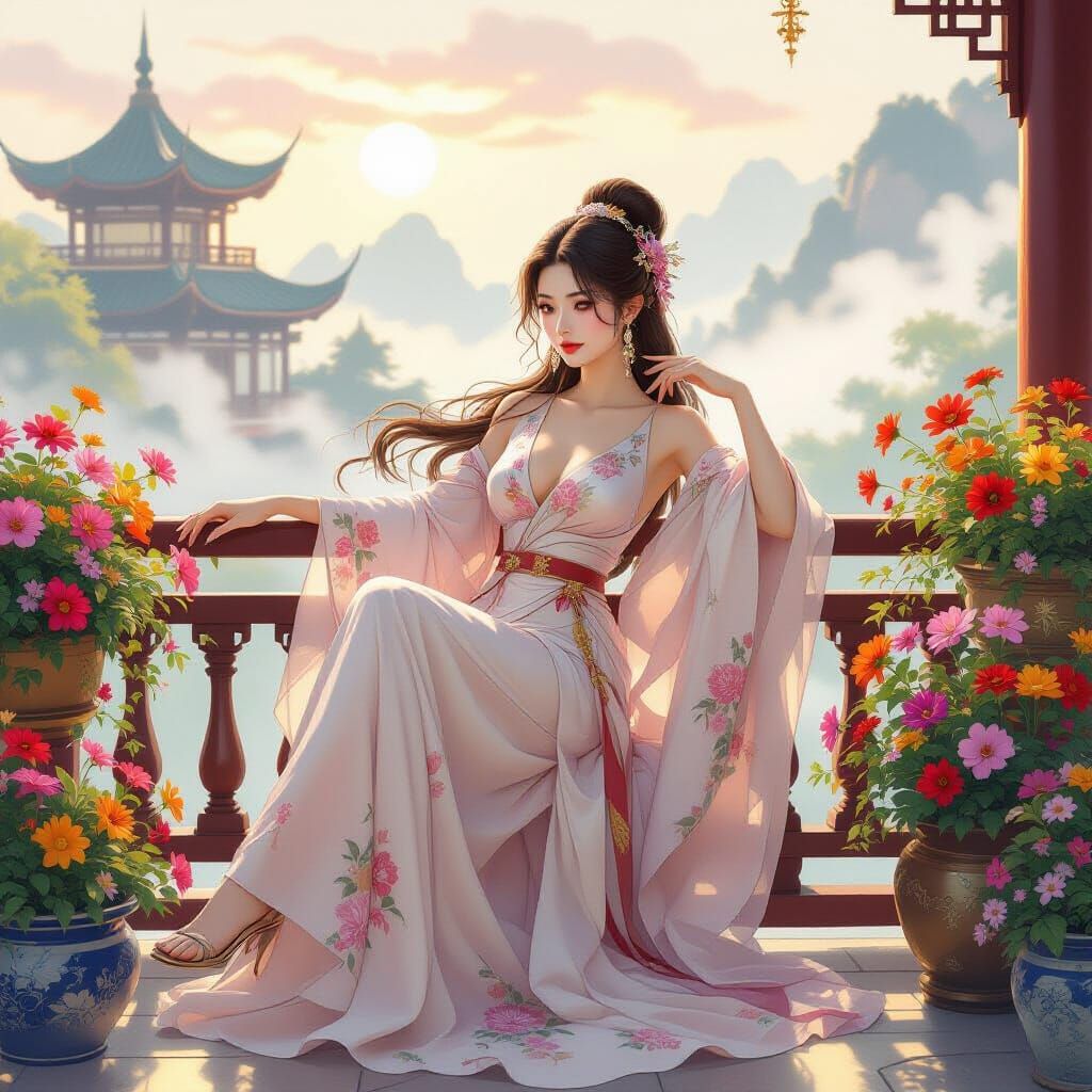 A beautiful image of an Asian fairy relaxing on a flower-covered balcony as the sun rises. The artwork is reminiscent of whimsical illustration art, using soft brushstrokes and delicate colors.