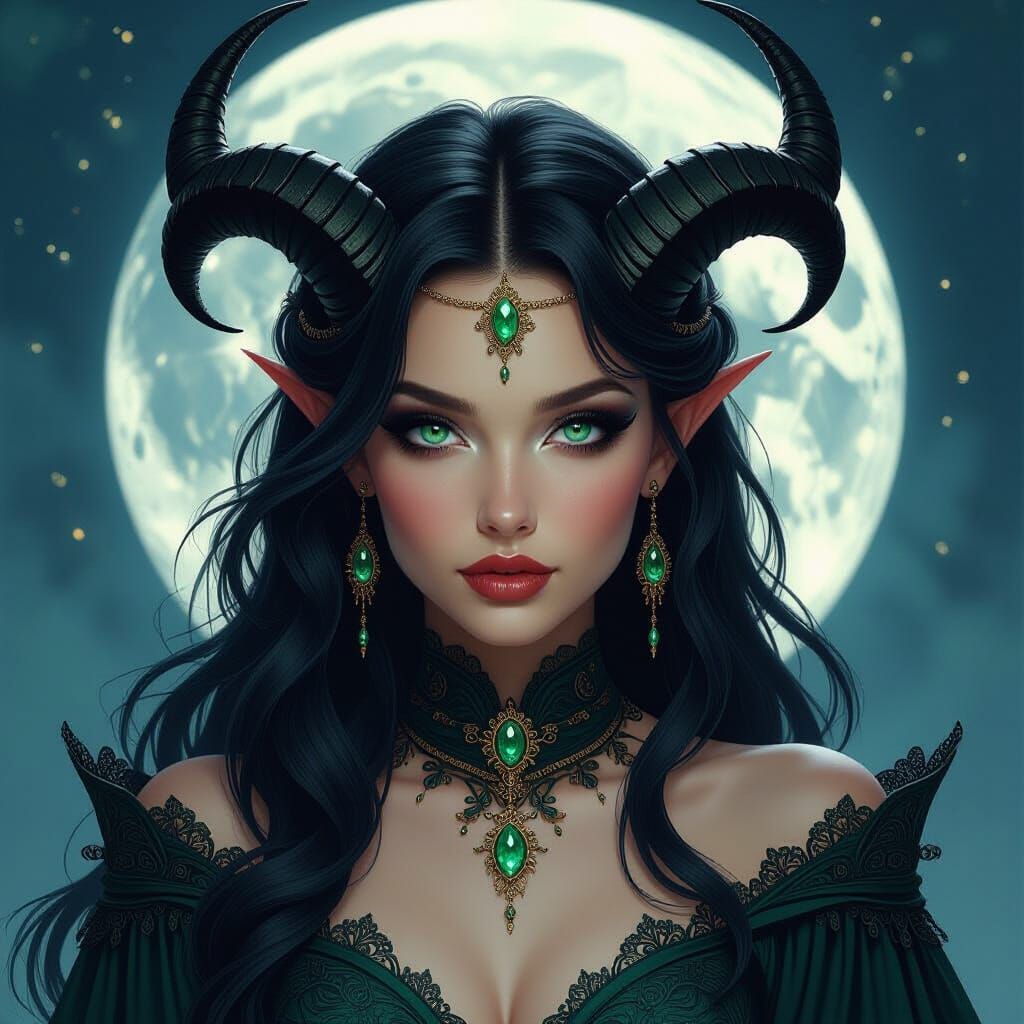 A captivating image of a dark-horned woman with striking emerald and sapphire eyes, adorned in mystical attire. This image presents a gothic aesthetic with ethereal textures, reminiscent of art nouveau.