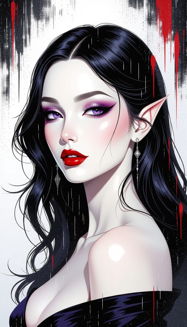 This image shows a beautiful, abstract female demon with alabaster skin and red lips, gazing seductively forward. The background features a digital matrix rain in white, black, and red, rendered as digital art.