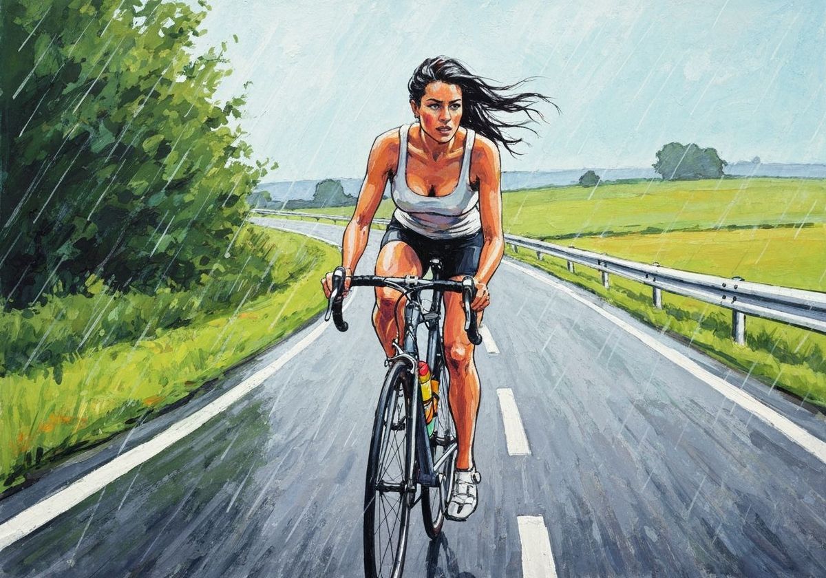 This image shows a young woman cycling on a rainy road. The artwork captures the scene using vibrant gouache and watercolor techniques to convey a sense of dynamic movement.