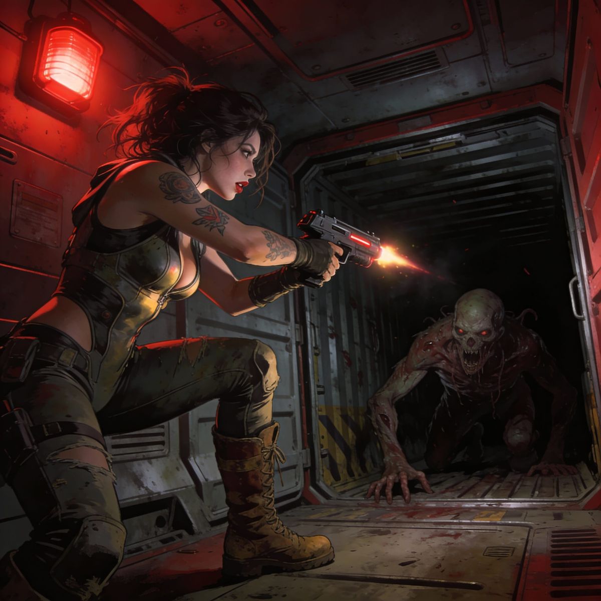This image depicts a sensual, realistic illustration of a female space operative with a plasma pistol confronting a grotesque alien in a cargo bay, illuminated by red emergency lighting.