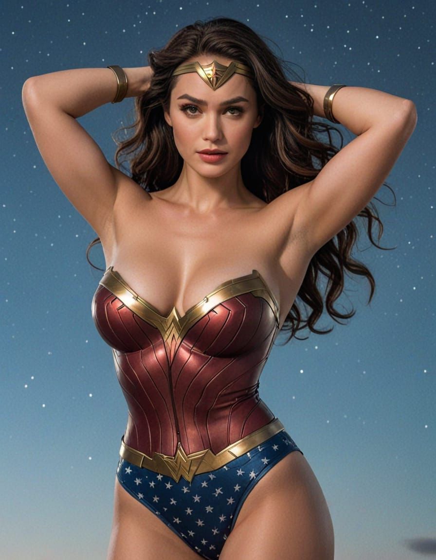 This image shows a superheroine with a voluptuous physique, clad in her signature attire. The backdrop features a starlit night sky, enhancing the character's powerful presence.