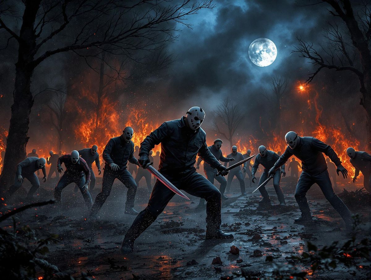 This image depicts a nighttime battle scene. Classic horror villains face a horde of zombies. The artwork features hyperrealistic details, high contrast, and a dramatic, cinematic atmosphere reminiscent of splash art.