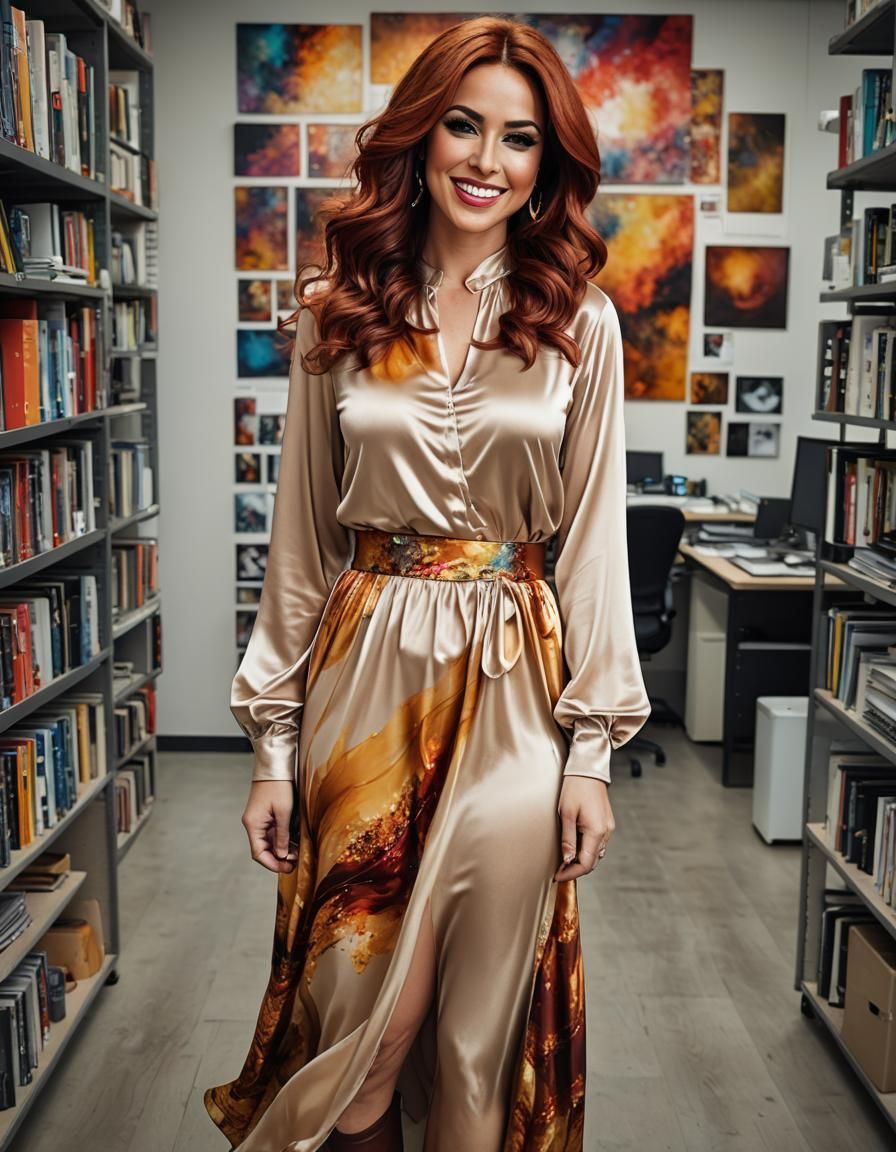 This image shows a vibrant, hyperrealistic portrait of a smiling Middle Eastern woman in a modern office setting. She has red hair, brown eyes and white skin, and is wearing a beige dress and brown boots, rendered as splash art.