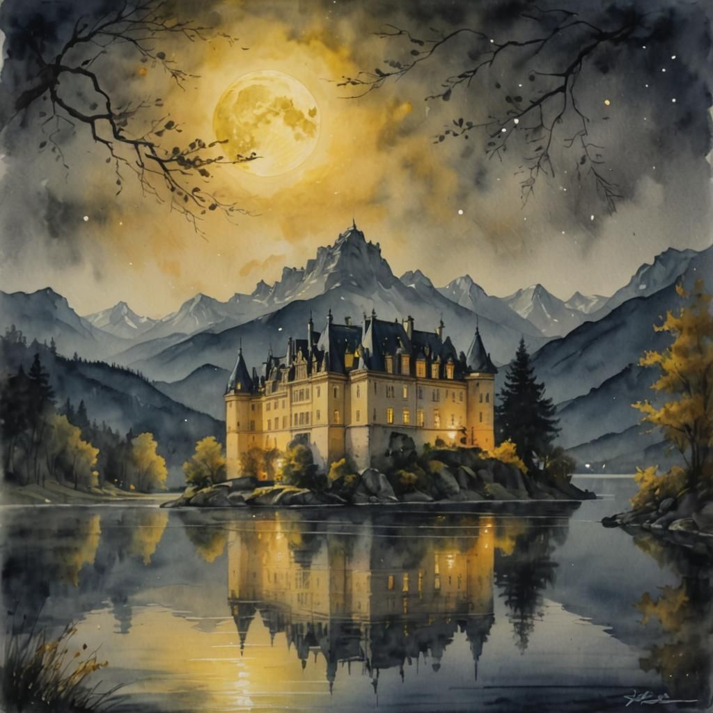 A luminous watercolor painting of a chateau. The building sits in front of a serene lake, surrounded by mountains and lit by a bright yellow moon in the night sky. Soft focus.