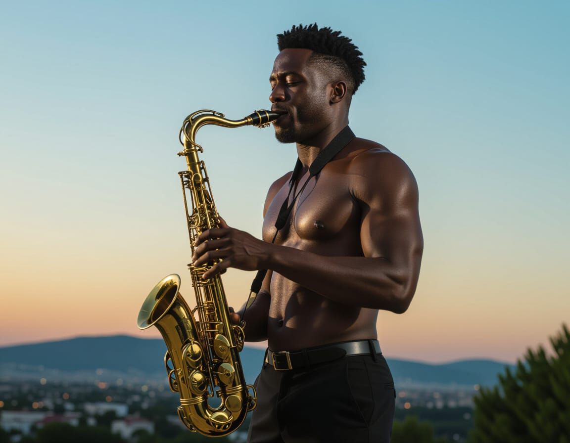 This image shows a Black man in chiaroscuro lighting reminiscent of Caravaggio paintings. He stands confidently, playing a brass saxophone, his music seemingly summoning ancestral spirits in the dusky atmosphere.