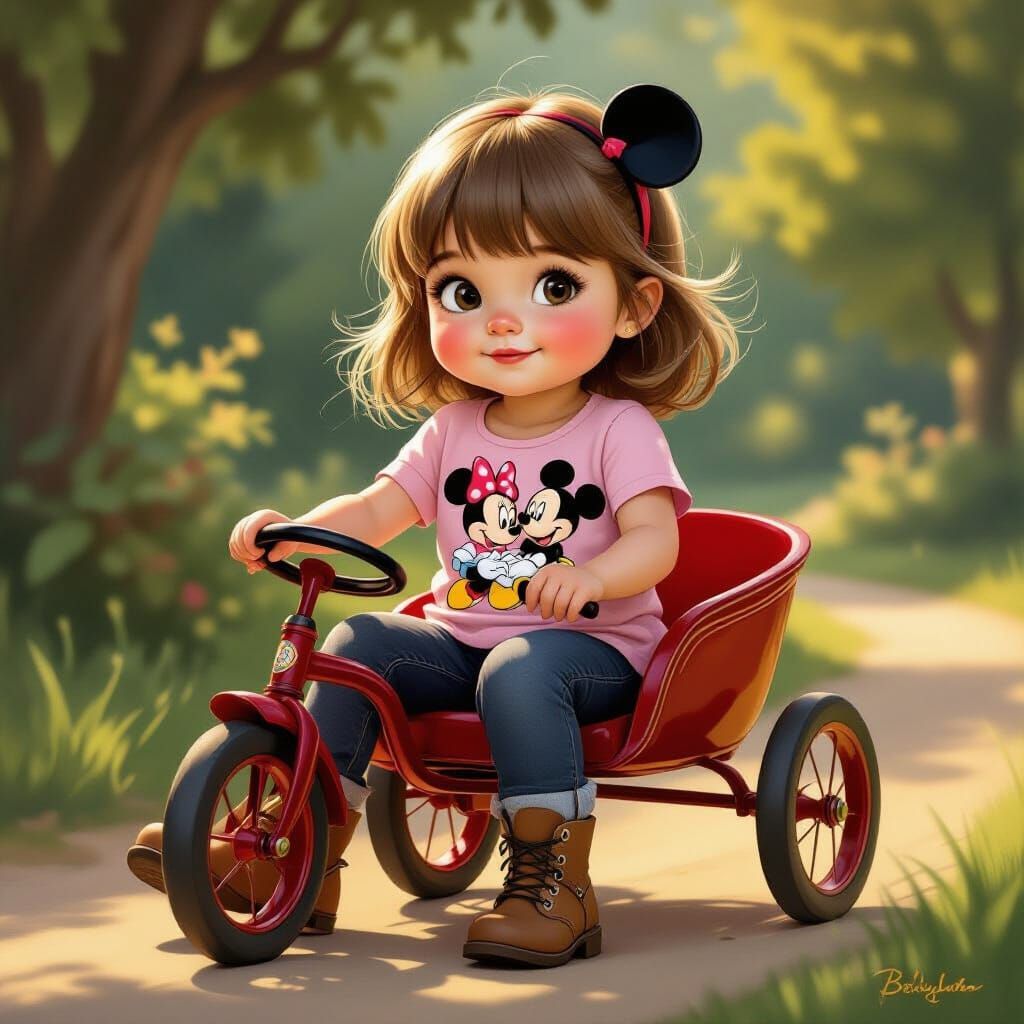 This image shows a cheerful three-year-old girl with light brown hair and a snotty nose, riding a red buggy. She wears jeans, a graphic t-shirt, and boots. Rendered in a soft, painterly storybook illustration style with vibrant colors.