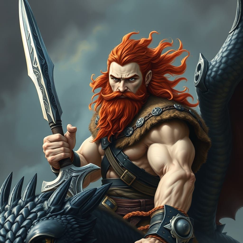 A striking picture of a muscular Viking warrior with red hair riding a black dragon. He is clad in leather armor and holds a Norse sword, rendered with dramatic lighting and atmospheric textures.