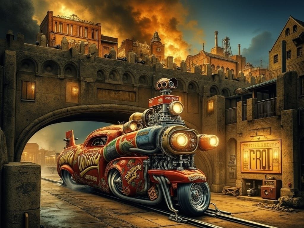 This image captures a futuristic, high-octane vehicle inspired by classic American boom cars, featuring vibrant 'Big Dog' livery and intricate, swirling patterns. Exposed engine components and rugged textures evoke a sense of high-performance power.