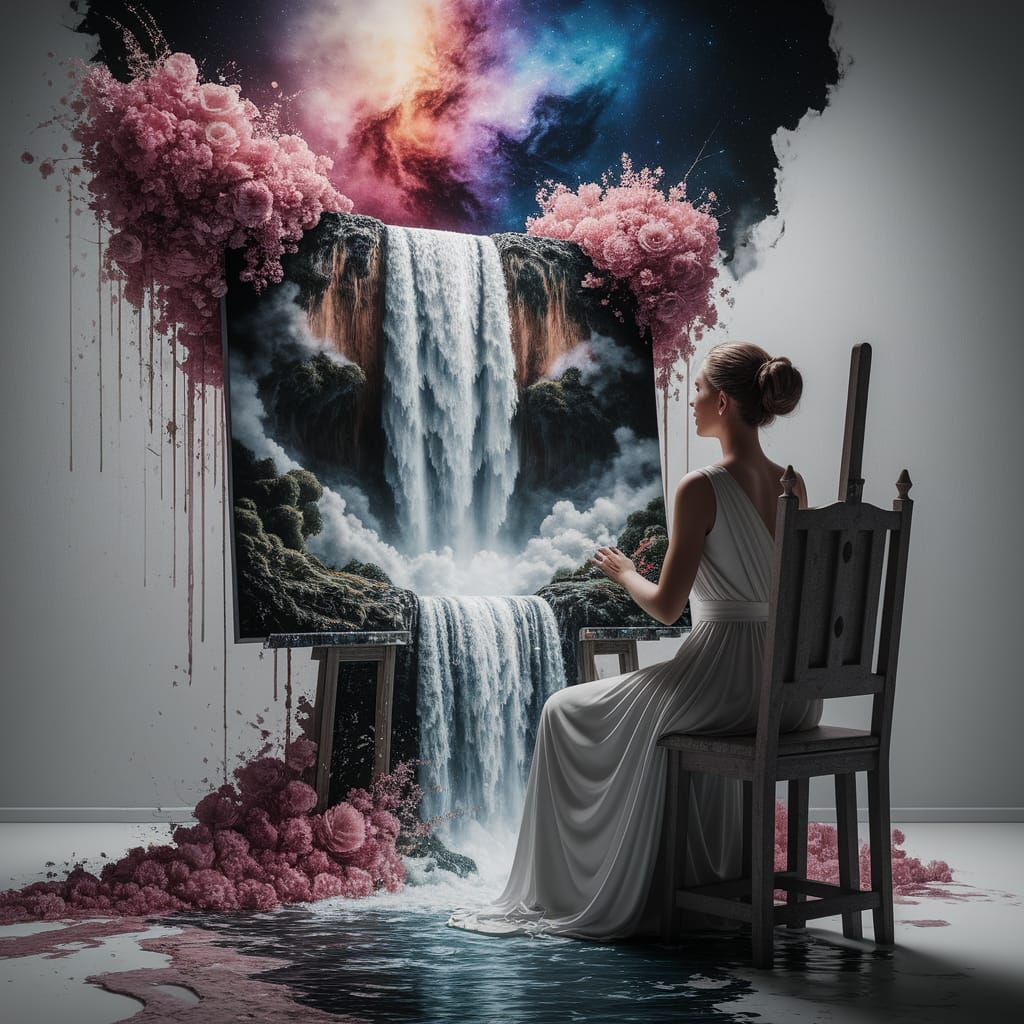 A close-up captures a beautiful artist at her easel as her cosmic waterfall painting bursts to life, cascading from the canvas. This watercolor artwork is a maximalist masterpiece.