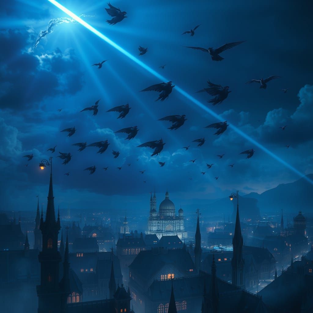 This digital artwork depicts a coven of witches soaring over a magical city at night. Cinematic lighting creates an ethereal glow, with luminescent streaks in the deep blue and purple sky.
