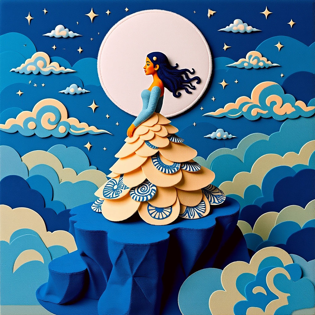 This image shows a felt woman with white hair and blue eyes. She is standing on a cliff with a felt moon, stars, and clouds in the background. The image has a vector fractal style.