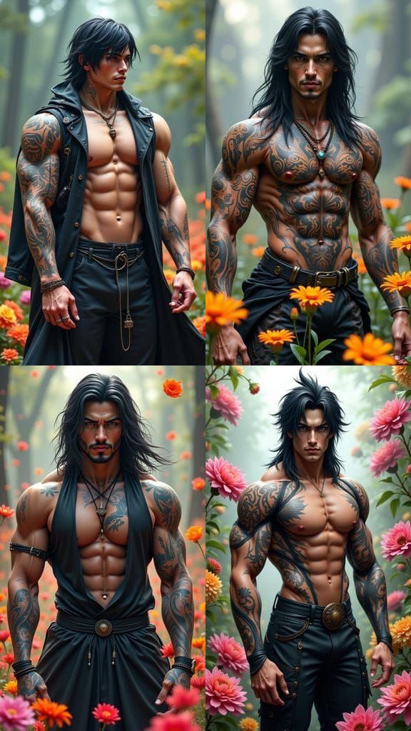 This image features a full-length digital artwork of a gorgeous Japanese cyborg-hybrid man with a stunning physique and long black hair, set in a vibrant flower garden. The art style is dark fantasy concept art with dynamic lighting.