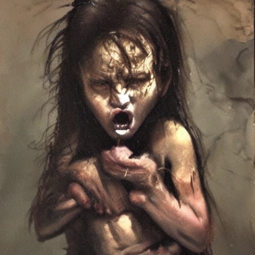 This image shows a grotesque figure consuming a child in an ominous landscape. The scene uses dark expressionism, oil painting techniques, and rough textures to evoke primal fear and visceral horror.