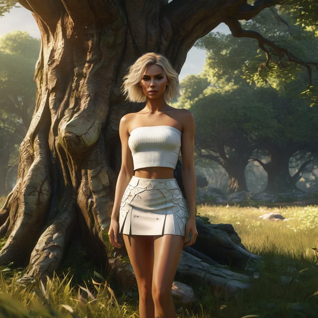 This image shows a blonde woman in a fantasy landscape. She stands in front of a tree with stone sculpture details, bathed in soft, warm sunlight, rendered with highly detailed textures and advanced lighting.