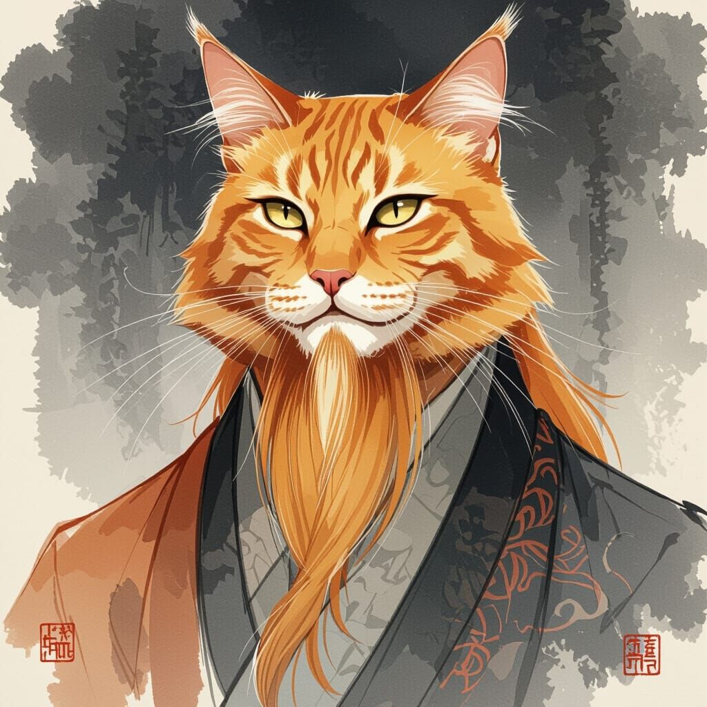 This image features an elegant orange cat humanoid with a traditional Chinese beard, created using flowing ink lines and negative space in a watermark art style. It evokes a serene, dreamlike atmosphere.