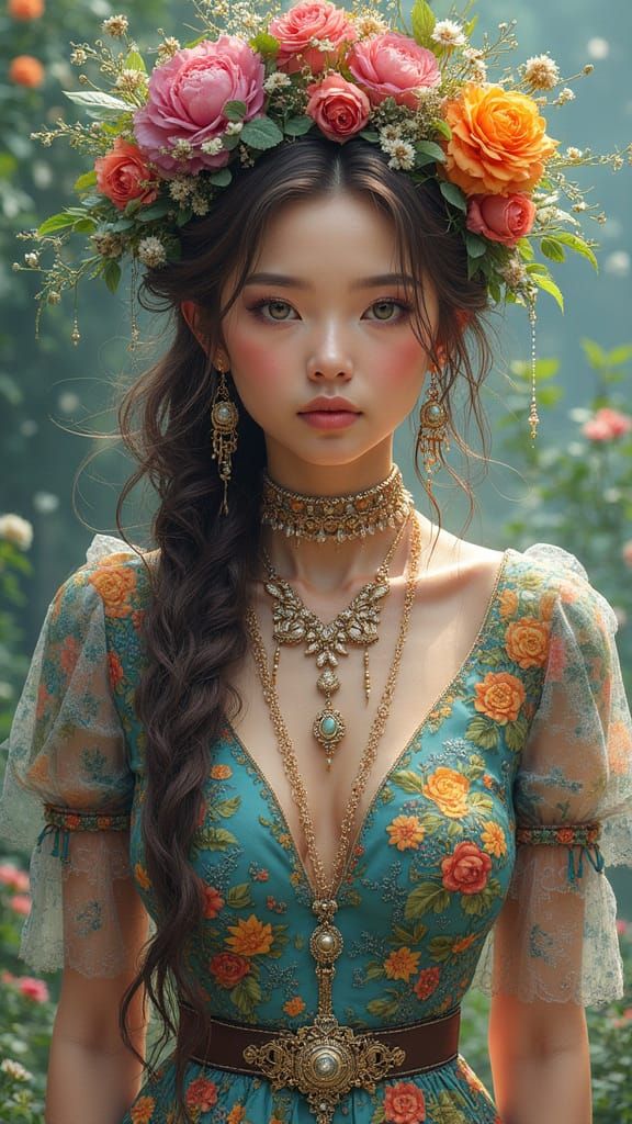 A striking picture of a woman in a surreal digital art style. She wears detailed colorful clothing and futuristic jewelry, with a flower garden growing from her hair and clothes.