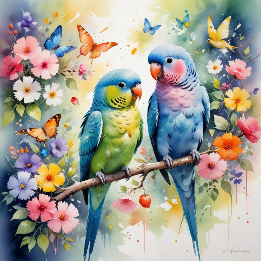A vibrant watercolor painting of pastel parakeets on a branch in a magical garden. This artwork features delicate watercolor techniques with cinematic stylization and hidden secrets.