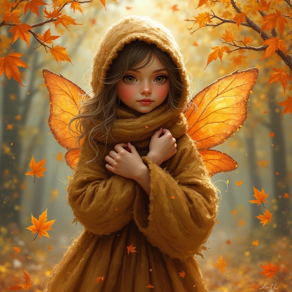 A digital image displays a fairy amidst a flurry of autumn leaves. Impressionistic style with warm colors and visible brushstrokes create a sense of whimsical motion and cozy ambiance.