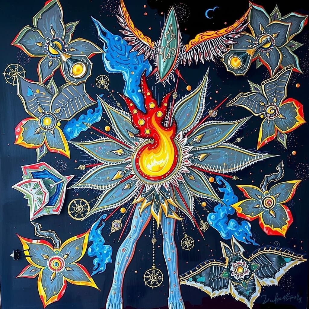 This image shows a vibrantly colored sculpture radiating light. The artwork is rendered in a painterly style, featuring a range of red hues to convey a sense of imminent glory.