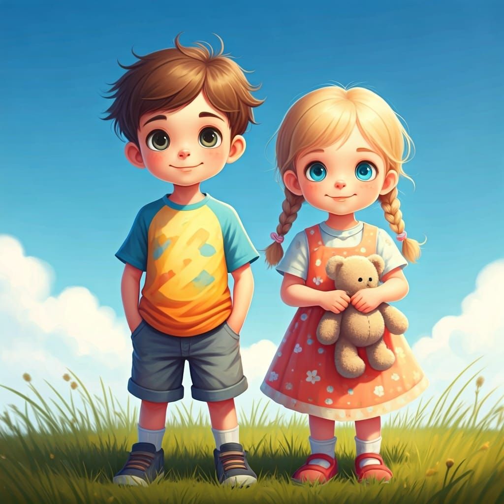 A digital illustration of a young boy and girl standing together in a field. The artwork features soft lighting and pastel colors, with a whimsical style.