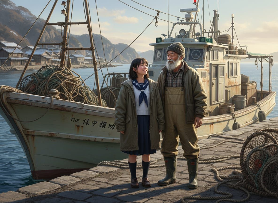 A realistic digital painting captures a seasoned fisherman and his aspiring granddaughter on a boat, showcasing a legacy of maritime passion in golden hour light.