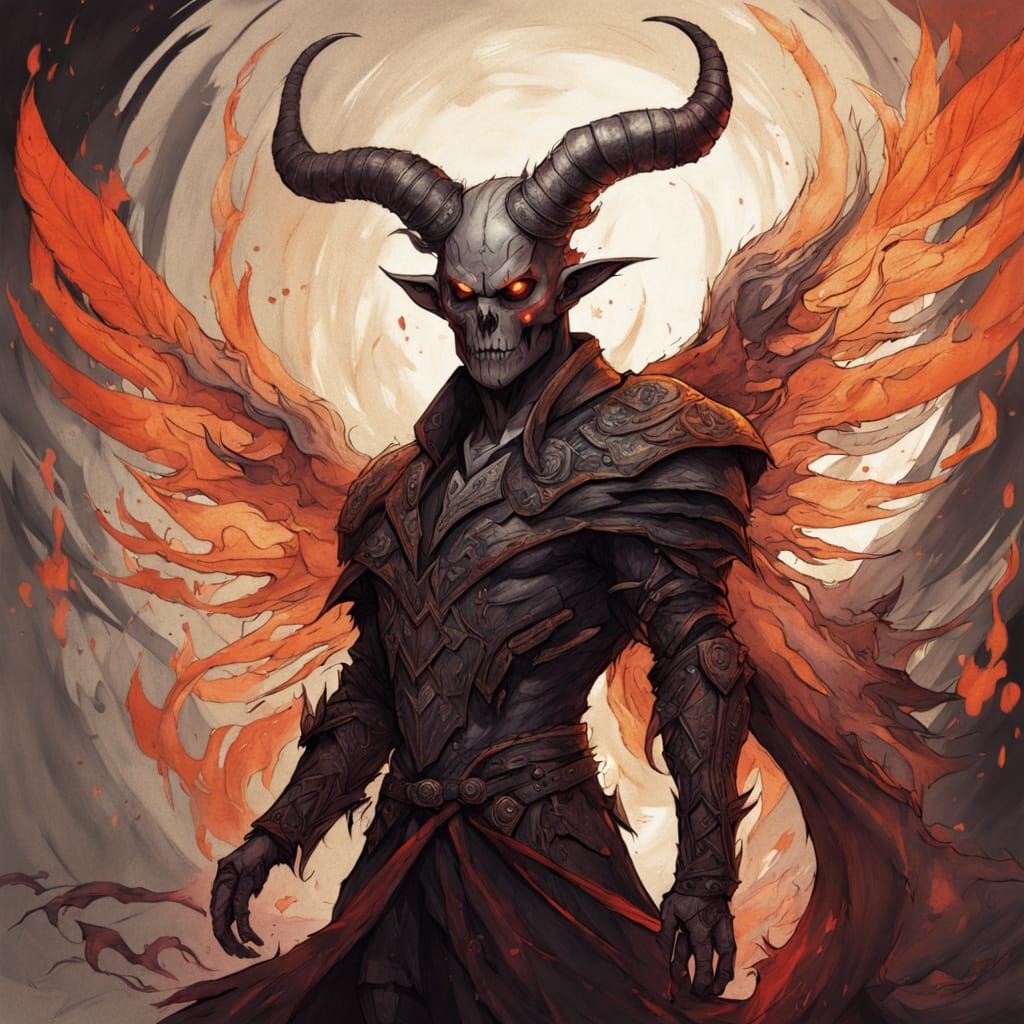 This image is a close-up portrait of a male Fallen Angel in a smoky, dimly lit room. He has horns and wings, and is surrounded by intense, fiery red and orange hues. Heavy shading and bold lines create a dramatic, hellish atmosphere.