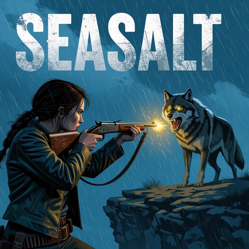 A cinematic scene depicts a determined woman confronting a snarling wolf on a rocky cliff under a stormy sky. The dramatic title 'Seasalt' is featured in a distressed font.