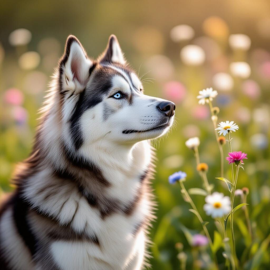 This image showcases a proud Siberian Husky delighting in the scent of vibrant wildflowers. Captured with professional DSLR photography, it features a shallow depth of field and natural lighting, emphasizing the dog's joyful expression and the floral details.