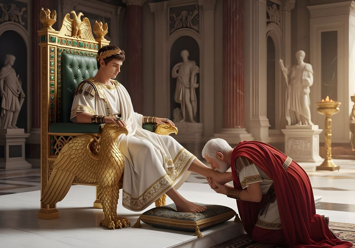 This image shows Emperor Nero on an opulent throne receiving homage. The scene depicts a vast Roman palace throne room in ultra-sharp focus, showcasing the intricate details of the era.