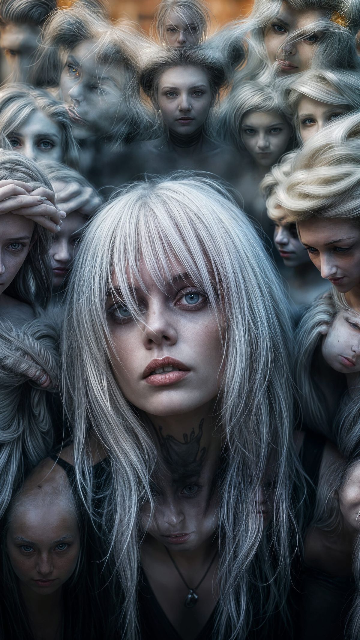 This image shows a zombie woman with white hair near Greek goddess statues. The close-up portrait is rendered with photorealistic detail, studio lighting, and sharp focus in a professional photography style.