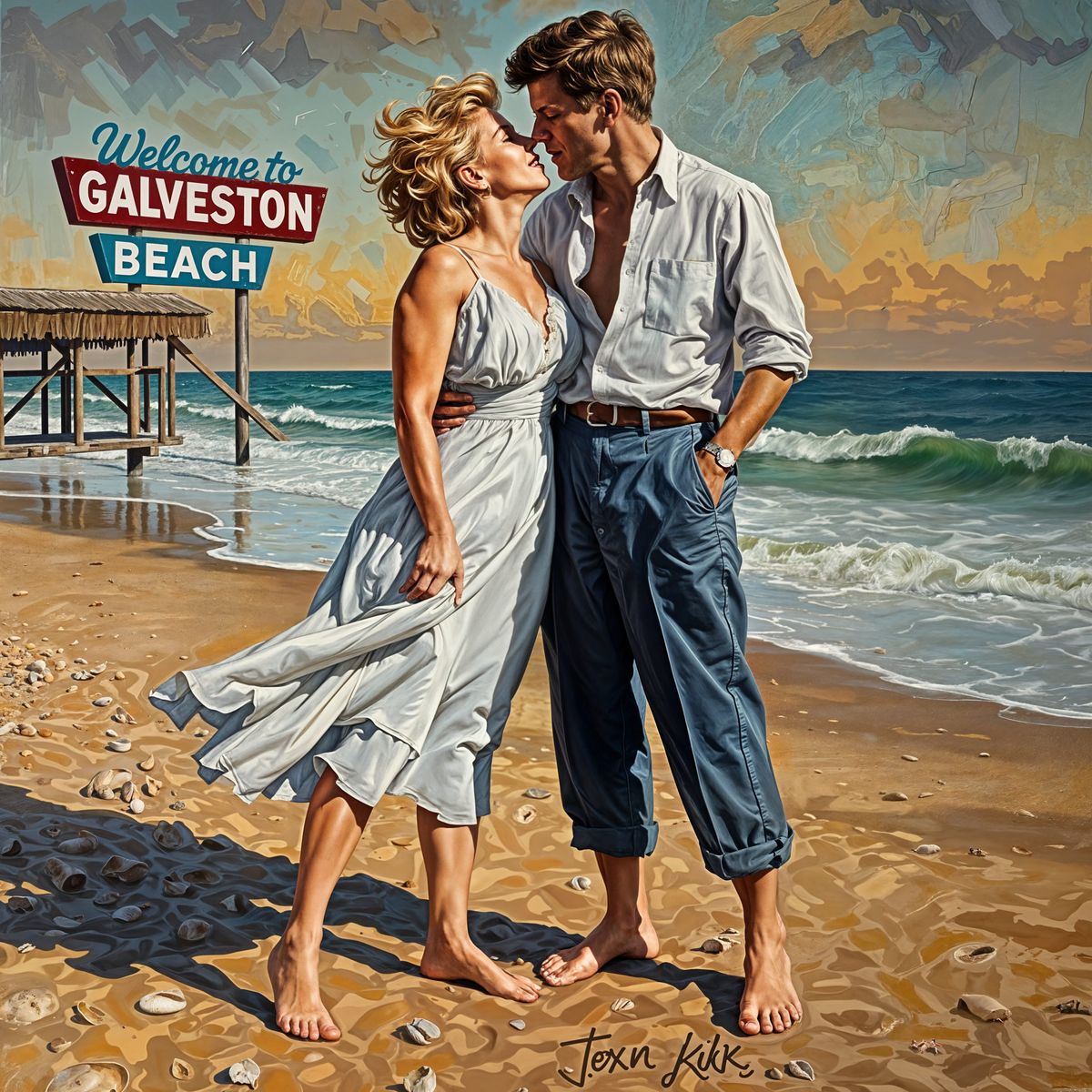 A romantic oil painting of Marilyn Monroe and John F. Kennedy embracing on a Galveston beach. The impasto style artwork captures a sunset scene with warm colors and textured brushstrokes, evoking a cinematic feel.