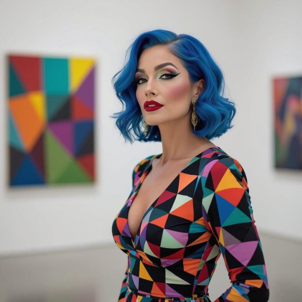 A vibrant image of a trans woman with striking blue hair in an art gallery. This pop art style portrait features bold makeup, a geometric dress, and moody lighting.