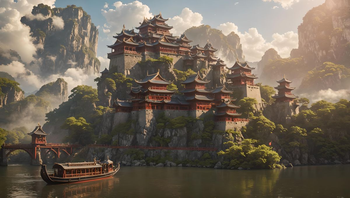 A striking picture of an ornate imperial barge on a river next to a round samurai castle on an island. The image has a cinematic feel with soft focus and natural lighting.