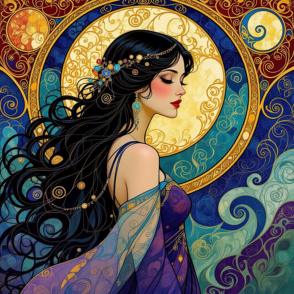 A striking picture of a beautiful woman with flowing hair in a surreal landscape. This artwork is reminiscent of Art Nouveau masterpieces, featuring golden textures, bold contrasts, and elegant lines.