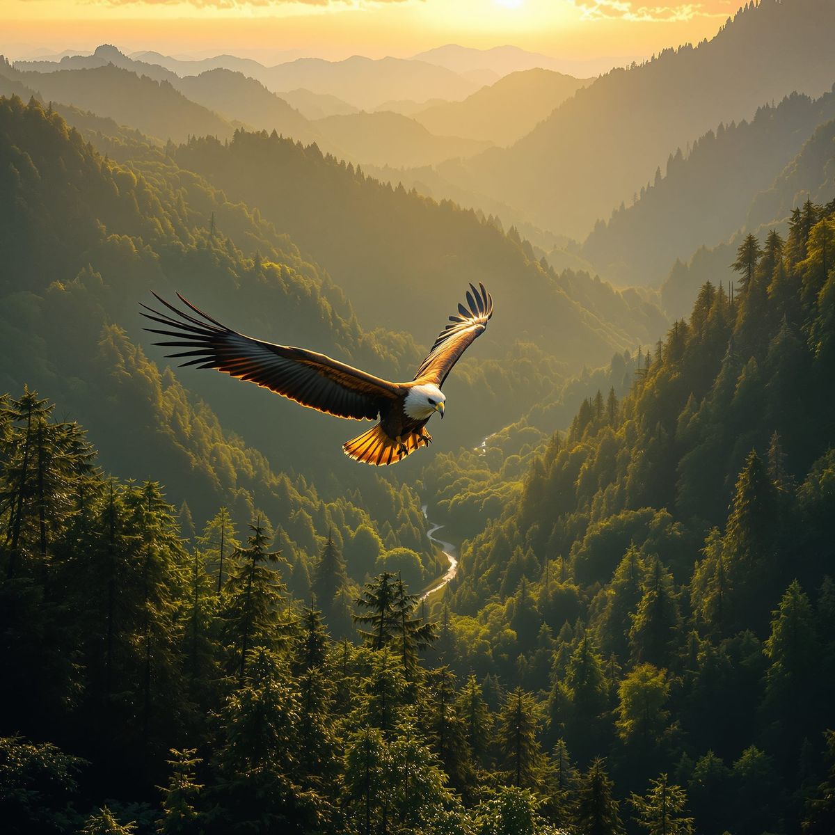 Cinematic image of a martial eagle flying over a sunlit wooded valley during golden hour. Captures dramatic wildlife photography and expansive landscape art styles. Highly detailed, 8K resolution.